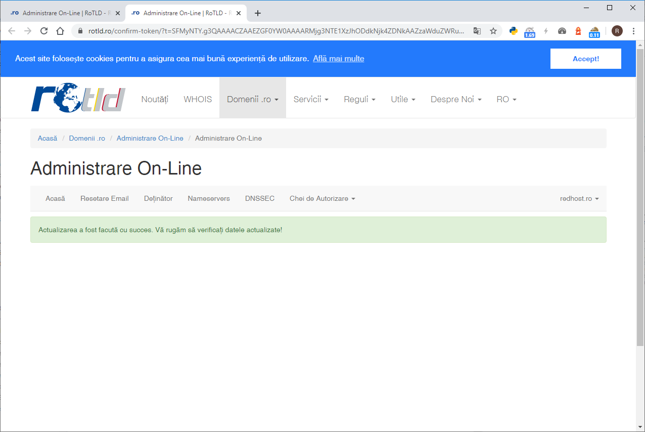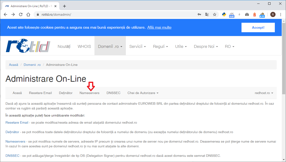 Tutorialul de mai jos poate fi utilizat pentru modificarea nameserverelor domeniilor .ro pe site-ul ROTLD Atentie: .